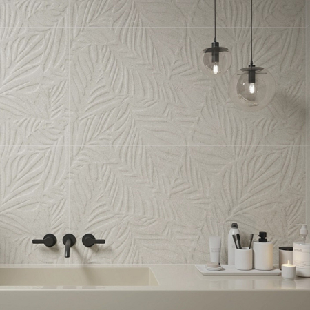 In de badkamer kun je de behanglook tegel gebruiken om een luxe en persoonlijke sfeer te creëren. Kies voor een mooi bloemmotief of een speelse print om de badkamer een frisse uitstraling te geven, of ga voor een rustieke look met een natuurgetrouwe afbeelding die perfect combineert met je badkameraccessoires.