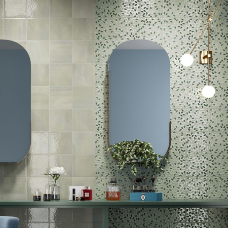 In de badkamer kun je de behanglook tegel gebruiken om een luxe en persoonlijke sfeer te creëren. Kies voor een mooi bloemmotief of een speelse print om de badkamer een frisse uitstraling te geven, of ga voor een rustieke look met een natuurgetrouwe afbeelding die perfect combineert met je badkameraccessoires.