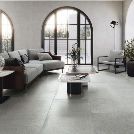 - Woonkamer: Creëer een moderne en strakke uitstraling met grote betonlook tegels in een neutrale tint.