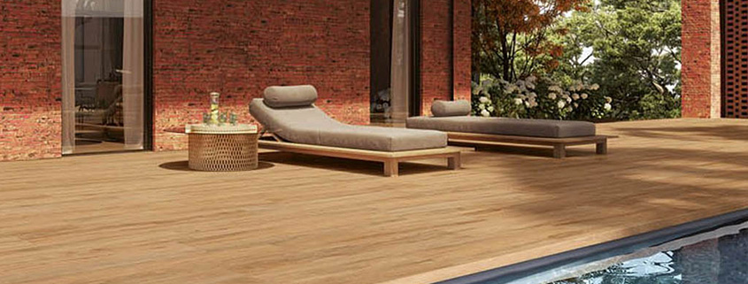 Zwembadranden: Dankzij de antislip eigenschappen zijn houtlook tegels ideaal voor gebruik rondom zwembaden, waar veiligheid voorop staat.