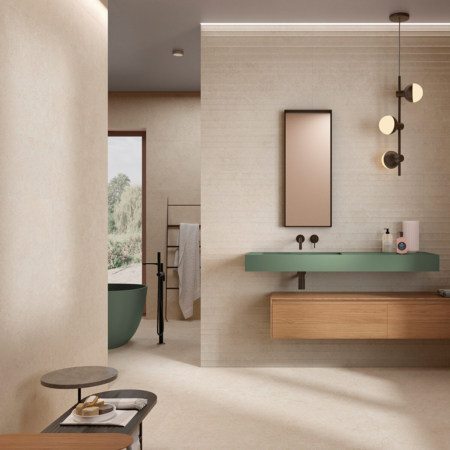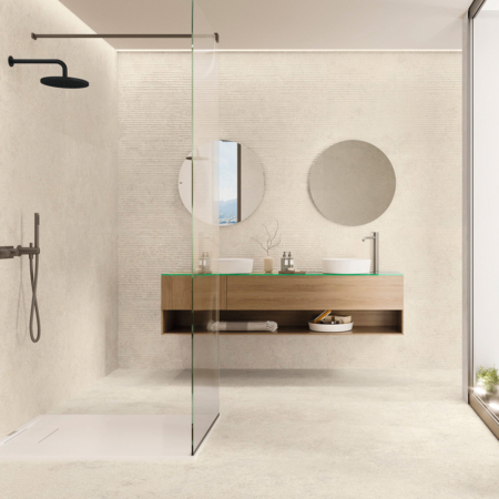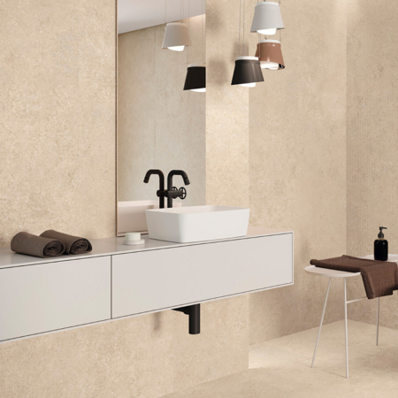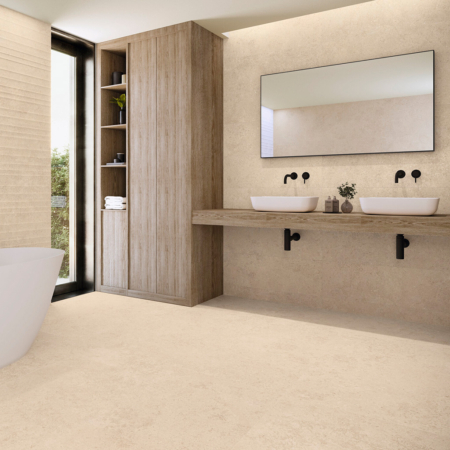 Travertinlook tegels geven een warme, natuurlijke uitstraling en passen perfect bij een landelijk of klassiek interieur. De zachte beige- en zandtinten zorgen voor een tijdloze elegantie.
