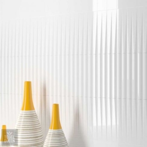 Witte tegels met een 3D-effect voegen diepte en textuur toe aan de ruimte, waardoor een dynamisch en visueel interessant effect ontstaat.