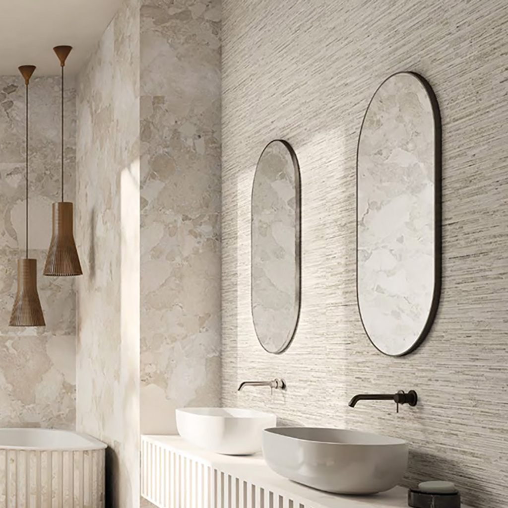 Matera Stone van Ergon bestaat uit twee verschillende versies, Neutra en Sassi. In de Sassi-variant is het oppervlak een samenstelling van kiezelstenen van verschillende groottes waardoor deze diepgang en dynamiek geeft. Bij de Neutra-variant is de textuur licht en gelijkmatig met subtiele kleurvariaties en natuurlijke aderpatronen. De texturen zijn afzonderlijk of in combinatie te gebruiken voor veelzijdige projecten. Voeg het Ritmo-decor toe voor extra stuctuur door het 3d effect.