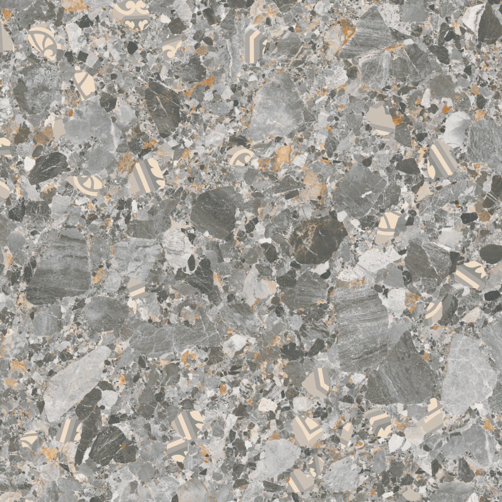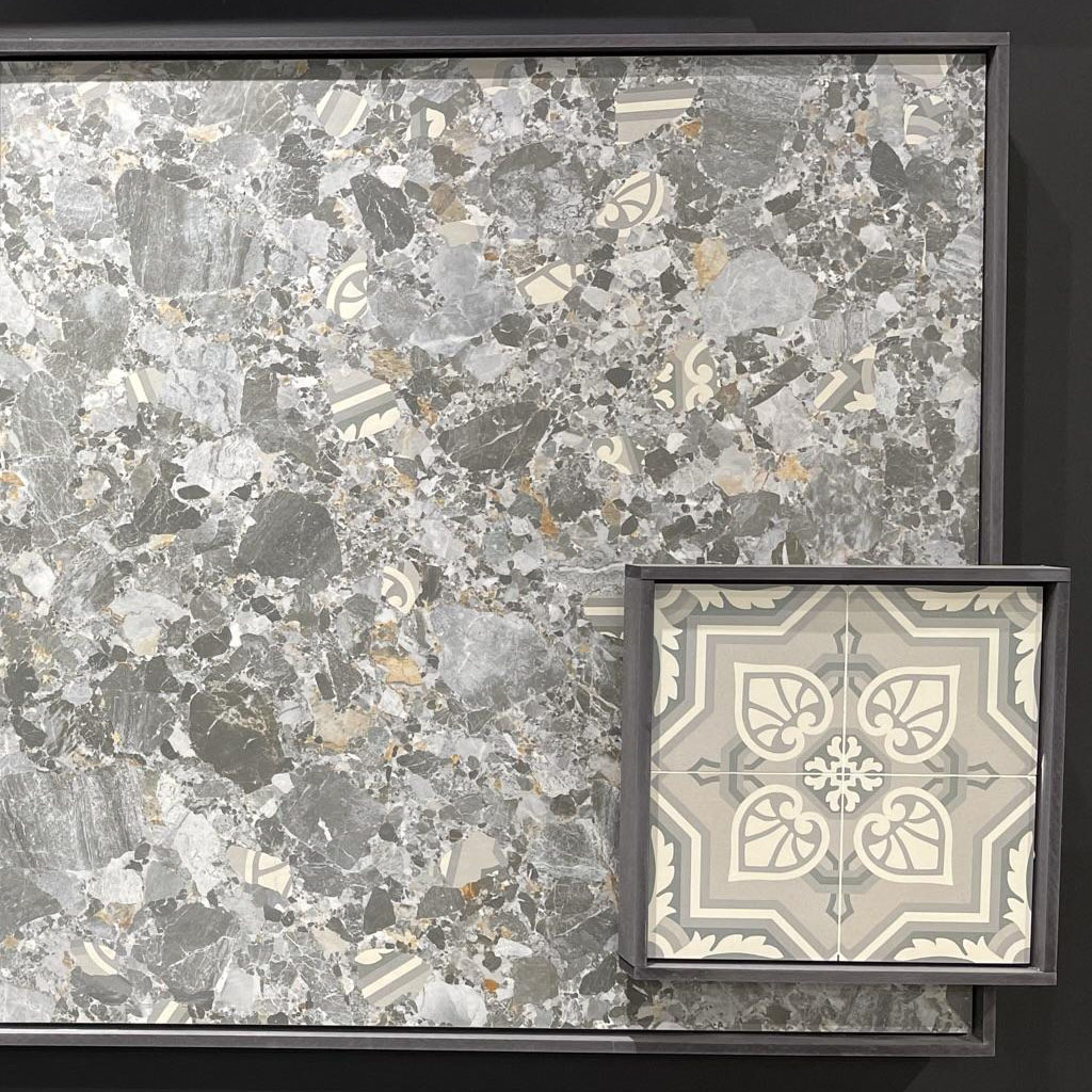De serie La Roche van het merk Revoir Paris is een terrazzolook tegel, waarin de gelijknamige patroontegel is verwerkt. DEZE TEGEL IS IN DE SHOWROOM TE BEZICHTIGEN.