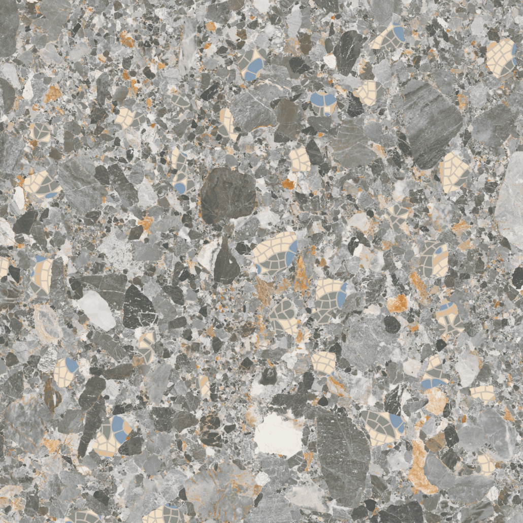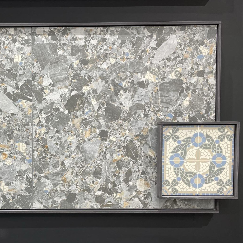 De serie La Roche van het merk Revoir Paris is een terrazzolook tegel, waarin de gelijknamige patroontegel is verwerkt. DEZE TEGEL IS IN DE SHOWROOM TE BEZICHTIGEN.